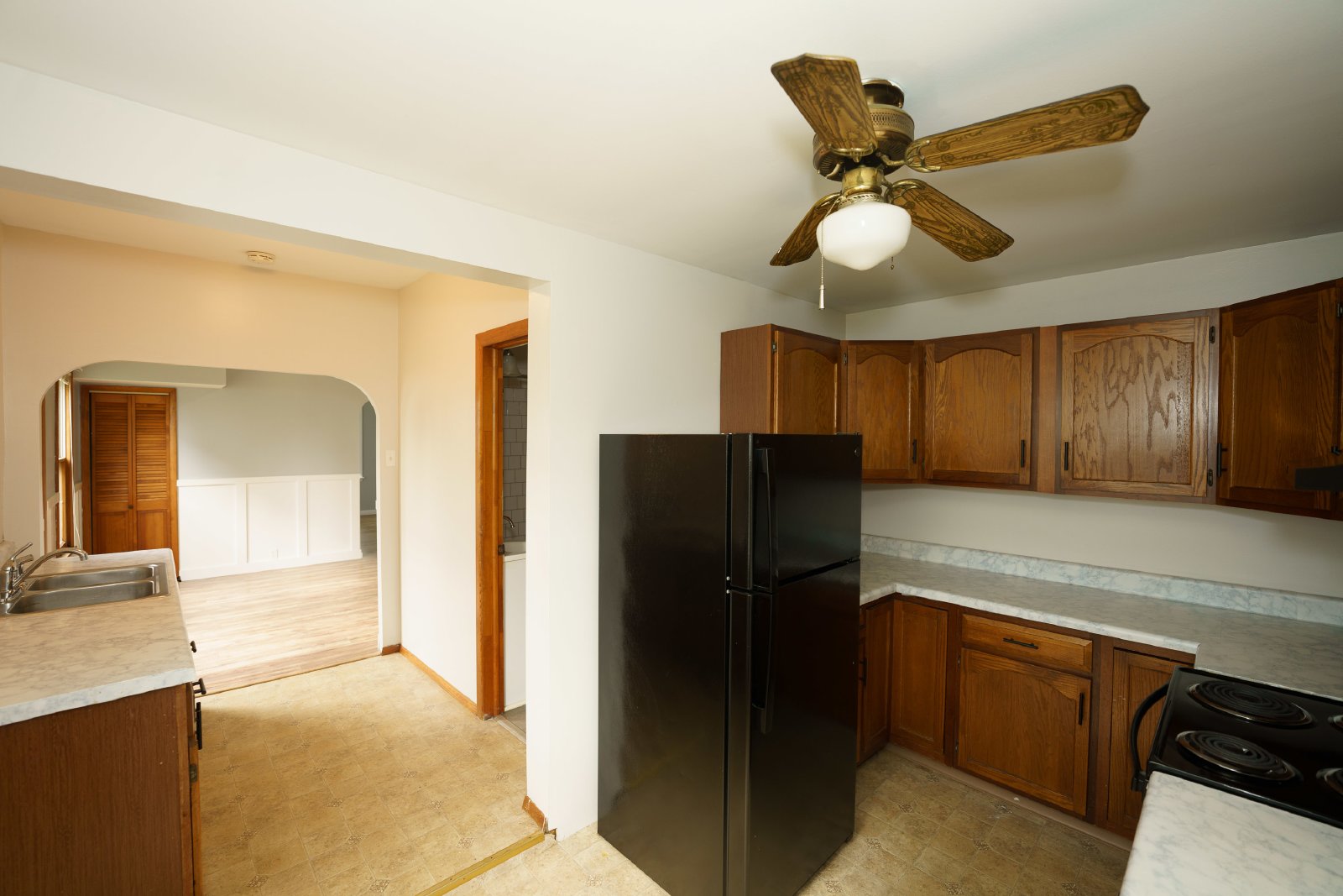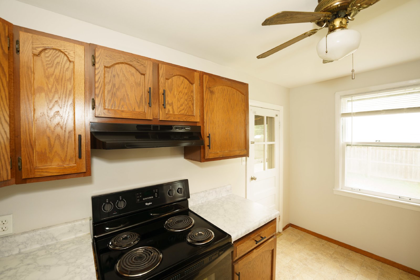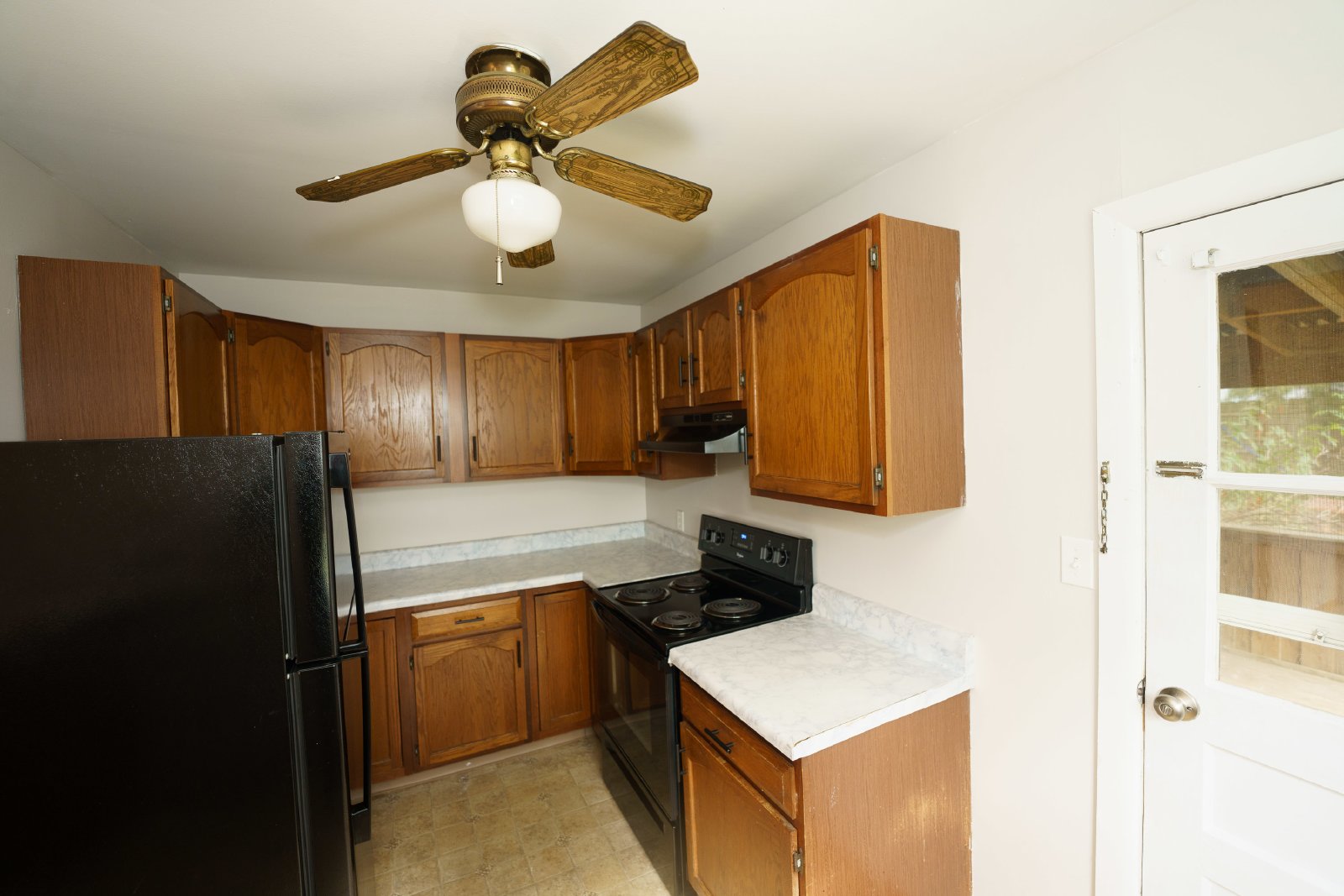 Spacious kitchen w/ plenty of counter space, electric stove w/ oven, ceiling fan, and a double bowl sink.