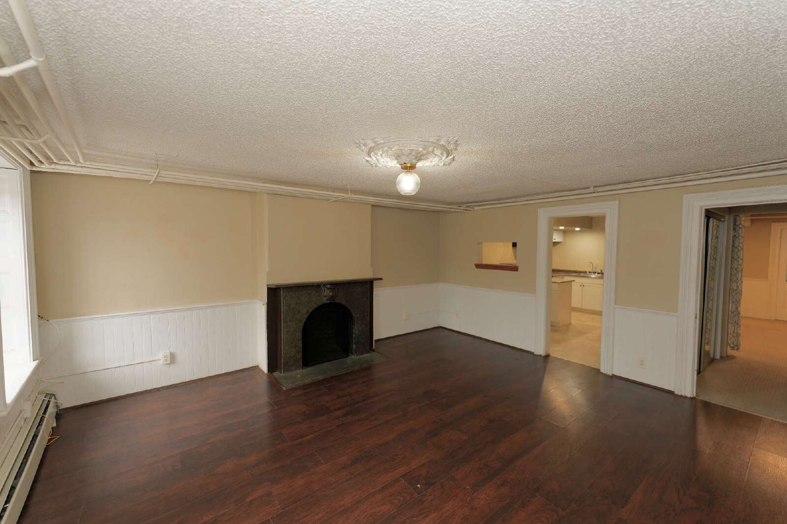 -Spacious living room that adds character with an ornate light fixture and a decorative fireplace mantle, just waiting to be adorned! (fireplace not in use)